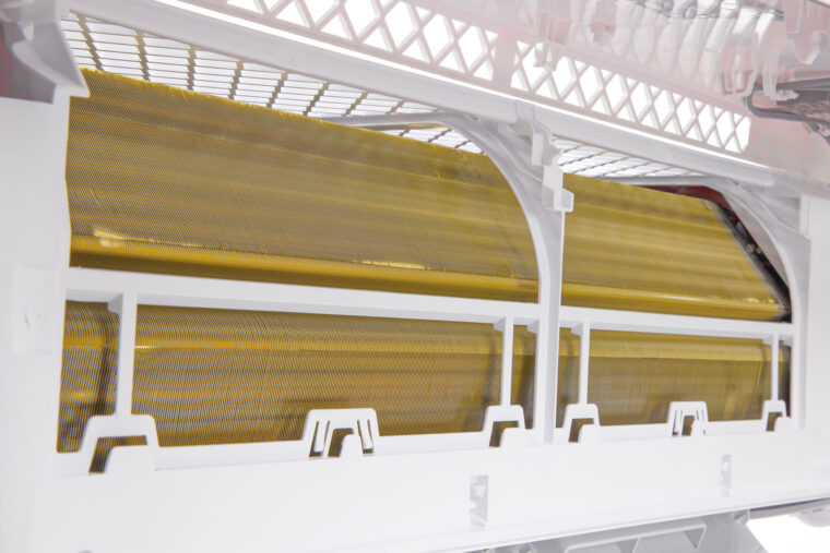 Unikátna povrchová ochrana pozlátením chráni vonkajšiu jednotku klimatizácie pred koróziou a vplyvmi počasia. Tým zaistí vyššiu účinnosť a dlhšiu životnosť klimatizácie.